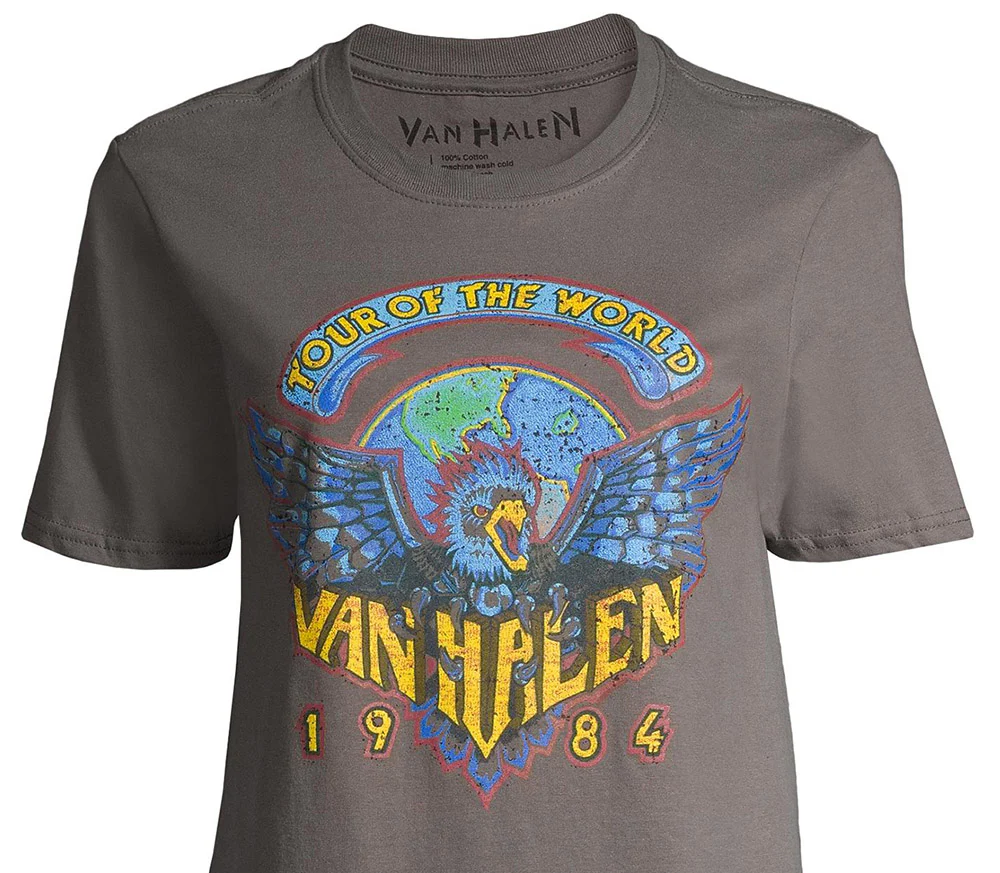 Women's charcoal tee featuring Van Halen's iconic eagle logo and "Tour Of The World" banner in distressed print. From their legendary 1984 world tour.
